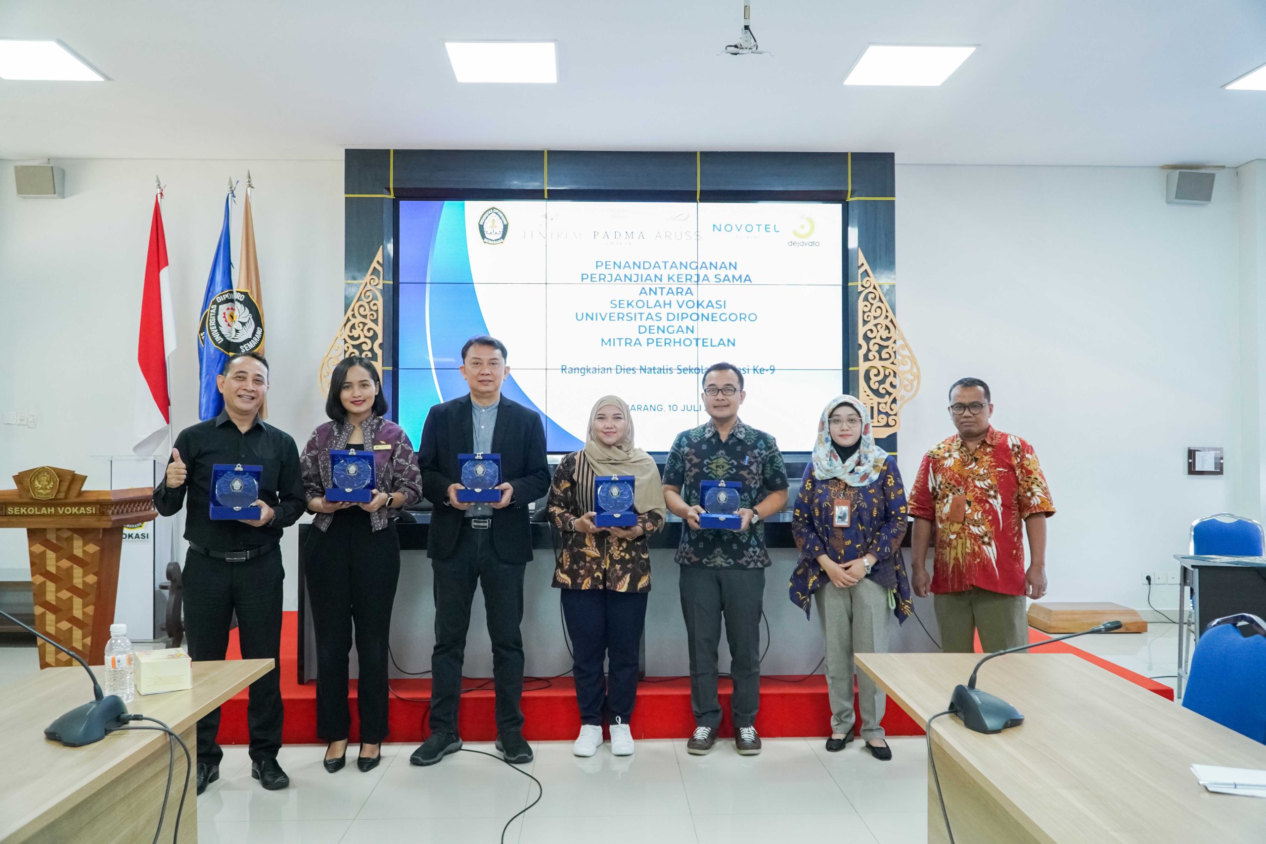 Semarang, July 10, 2025 – The Vocational School of Diponegoro University (UNDIP) has officially established a partnership with four prominent hotels in Semarang—Novotel Hotel, Padma Hotel, Tentrem Hotel, and Aruss Hotel—as well as one non-governmental organization (NGO), Dejavato Foundation. The collaboration was formalized through the signing of a Memorandum of Understanding (MoU) on July 10, 2025, held at the 4th Floor Meeting Room of the Vocational School of UNDIP.